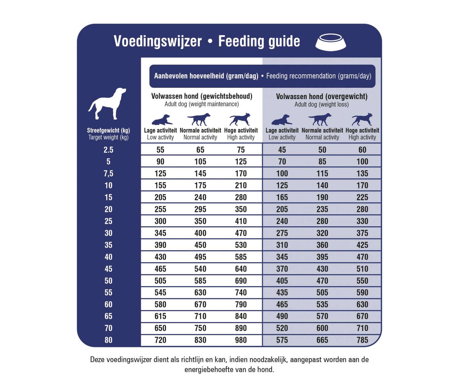 Le tableau des rations journalières, avec les quantités recommandées selon le poids du chien et son niveau d’activité (faible, moyen ou élevé), est indiqué au dos du sachet de croquettes.