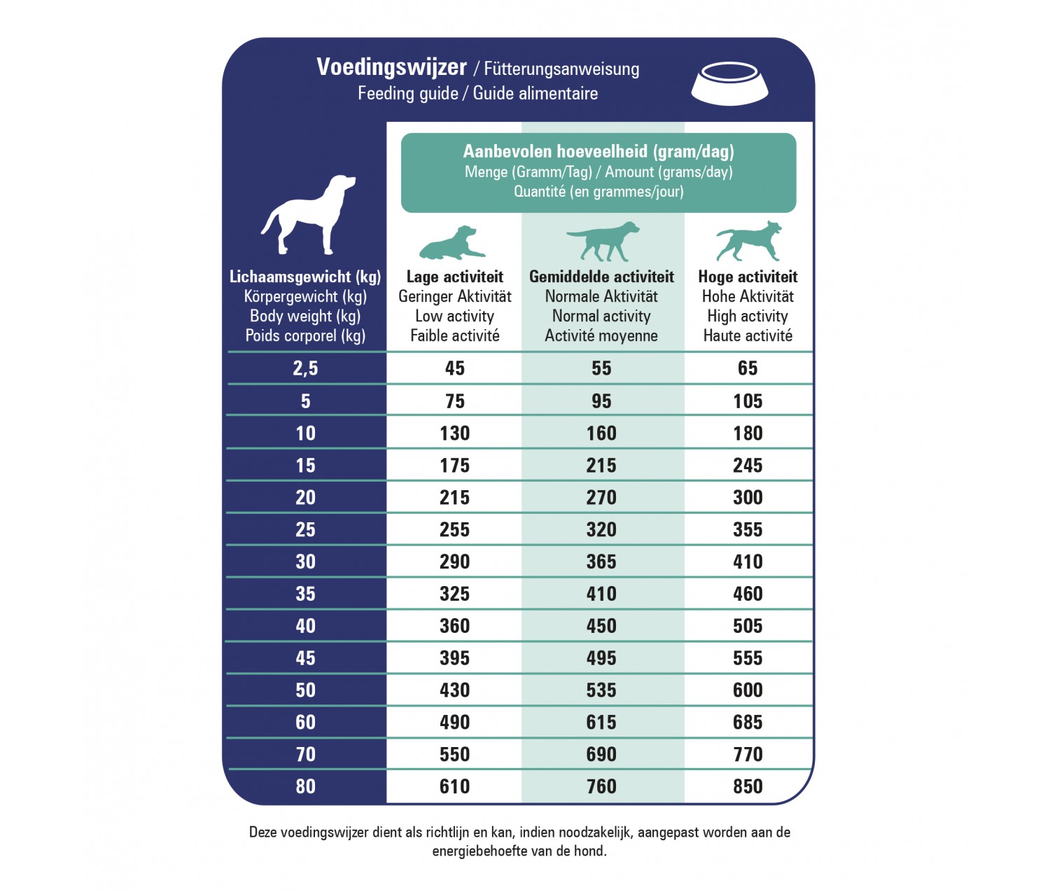 La quantité quotidienne dépend du poids, de l’âge et du niveau d’activité de votre chien. Le tableau indicatif des rations figure au dos de l’emballage.