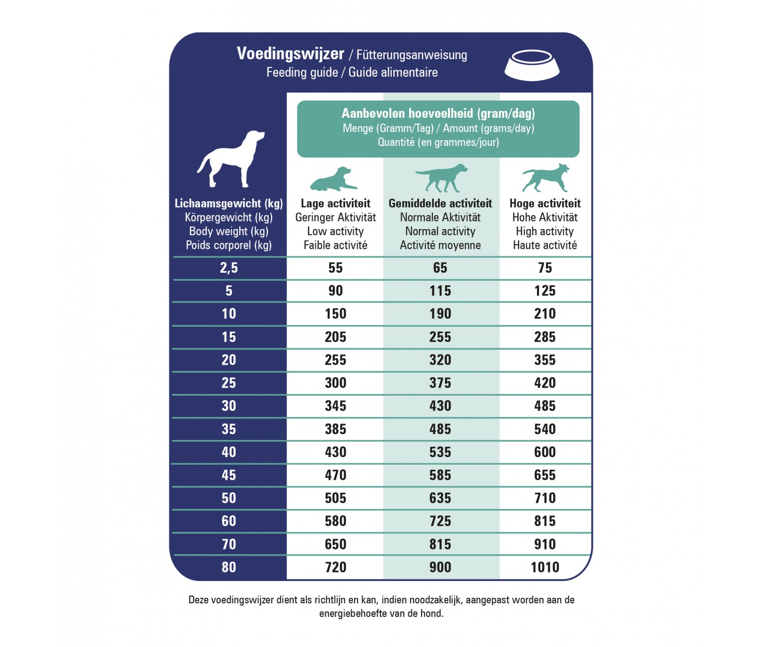 La quantité quotidienne dépend du poids, de l’âge et du niveau d’activité de votre chien. Le tableau indicatif des rations figure au dos de l’emballage.