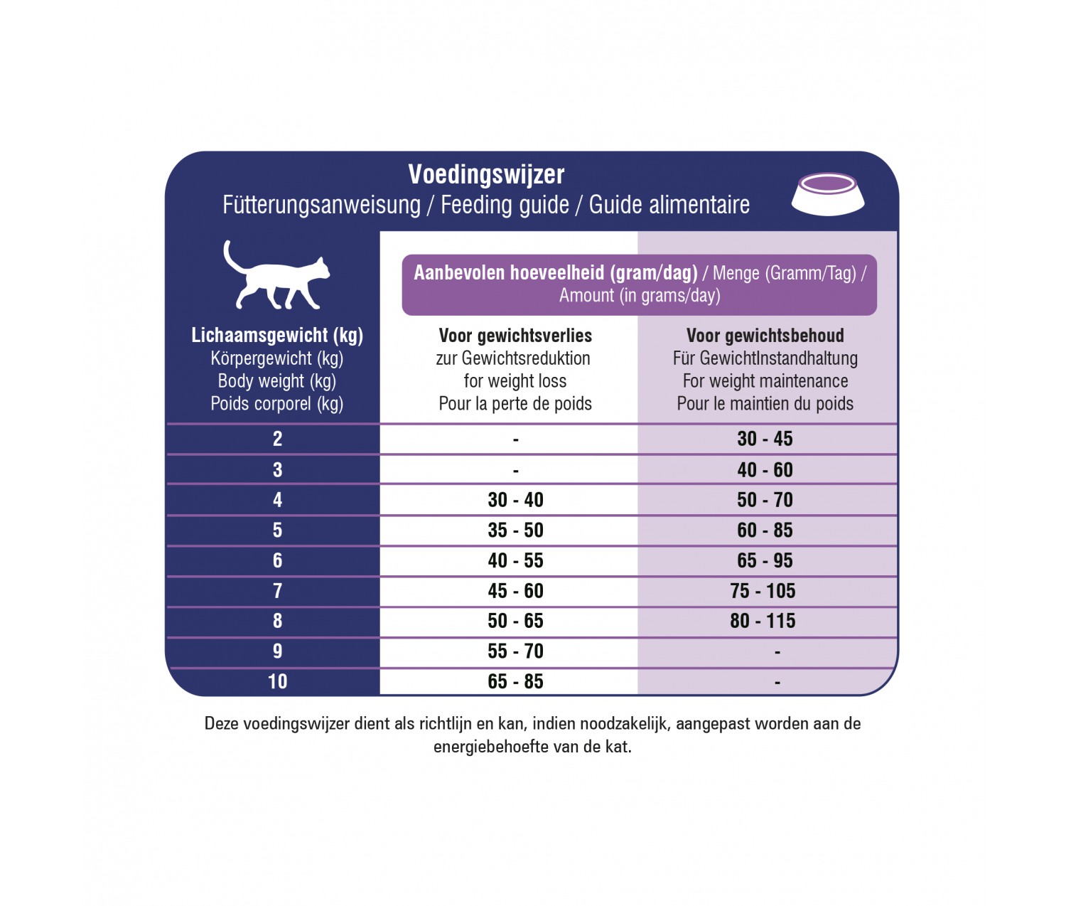 La quantité quotidienne dépend du poids, de l’âge et du niveau d’activité de votre chat. Le tableau indicatif des rations figure au dos de l’emballage.