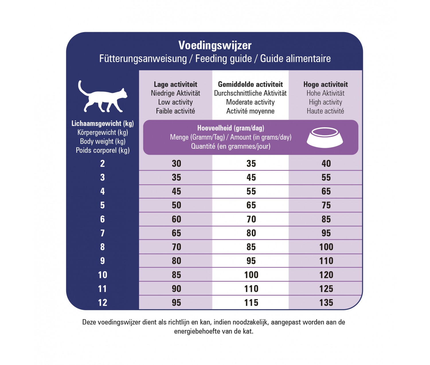 La quantité quotidienne dépend du poids, de l’âge et du niveau d’activité de votre chat. Le tableau indicatif des rations, exprimé en grammes par jour, est disponible sur l’emballage du produit.
